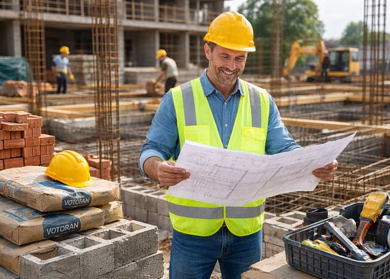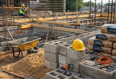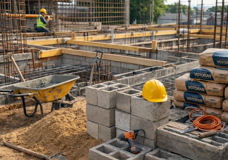 Soluções completas para quem está iniciando a obra, com materiais básicos, ferramentas e suporte para cada etapa da estrutura.